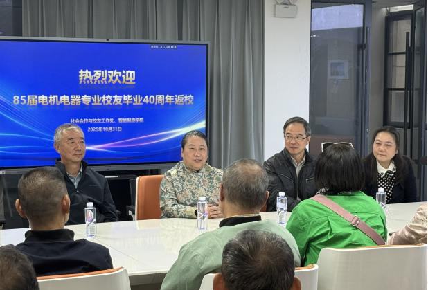 2025年10月31日,江汉大学智能制造学院85届电机电气专业校友重返母校,在师生服务中心三楼校友之家隆重举行毕业四十周年返校座谈会。江汉大学副校长向悦、社会合作与校友工作处处长李卫东、智能制造学院党委书记沈燕、党委副书记陈曦出席活动,与校友们齐聚一堂,共忆青春岁月。