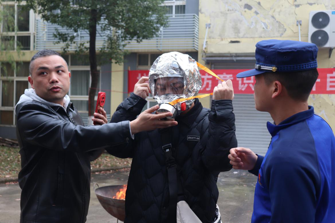 活动现场,消防指导员结合校园实际,重点围绕防护面罩佩戴与灭火器使用两项核心技能展开教学。在面罩使用环节,指导员细致讲解结构特点与佩戴要领,同学们踊跃上前实操,在“手把手”指导下迅速掌握正确佩戴方法,为火场中的自我防护多一份保障。