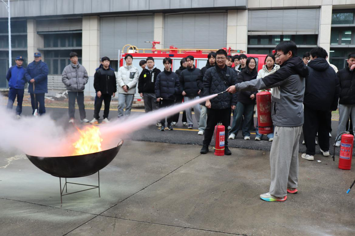 针对灭火器使用,指导员不仅说明校内教学楼、实验室、宿舍等场所的器材摆放位置,更以“提、拔、握、压”四字口诀为核心,演示灭火全程。随后的实操体验中,同学们分组上场,亲手操作灭火器扑灭起火点,真正体验了一回“灭火实战”,轻松掌握扑救初期火灾的关键步骤。